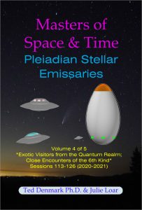 Ted Denmark, Ph.D. & Julie Loar, Masters of Space & Time: Pleiadian Stellar Emissaries, Volume 4, *Exotic Visitors from the Quantum Realm*, Amazon 6×9 paperback (color), Kindle ebook & PDF, 2023.